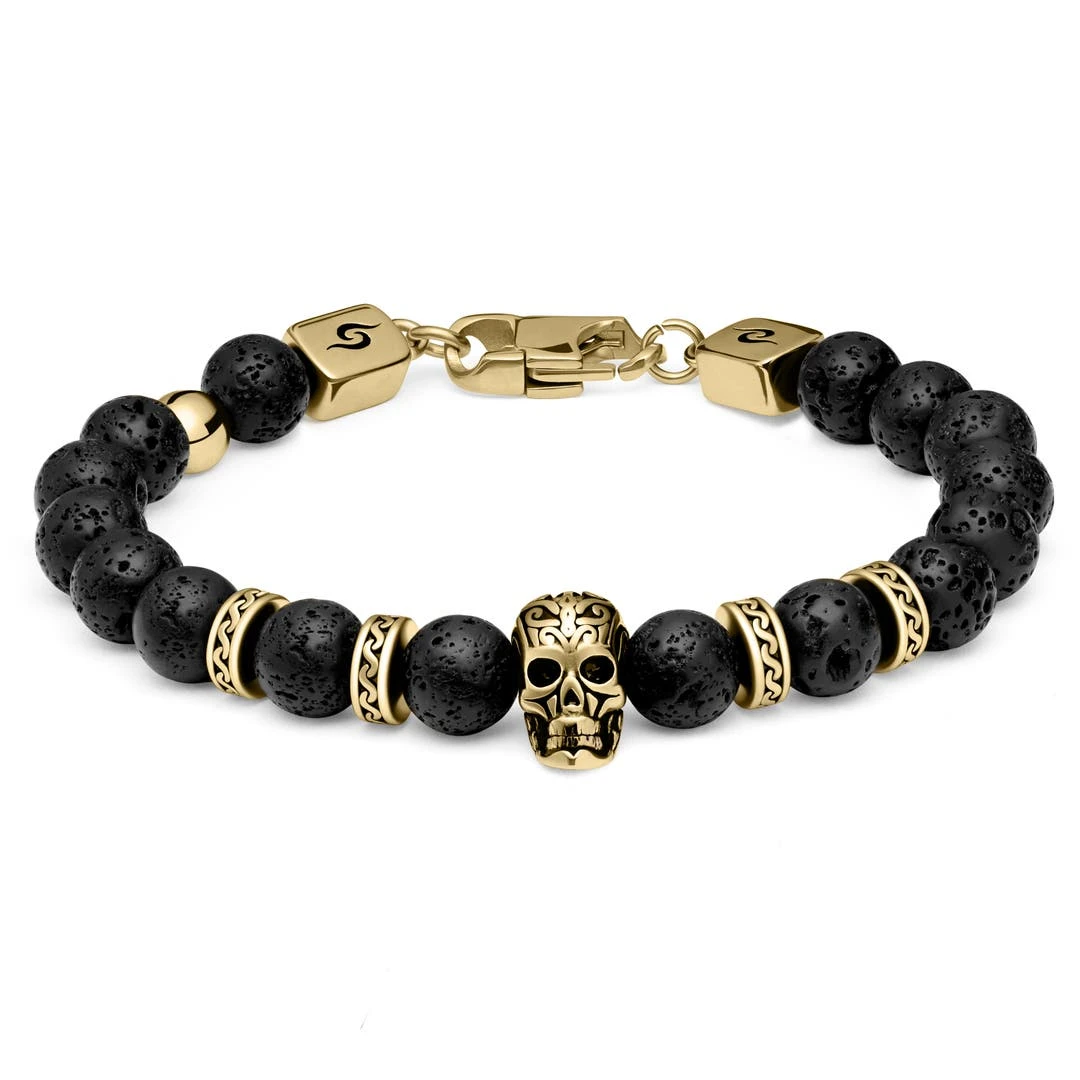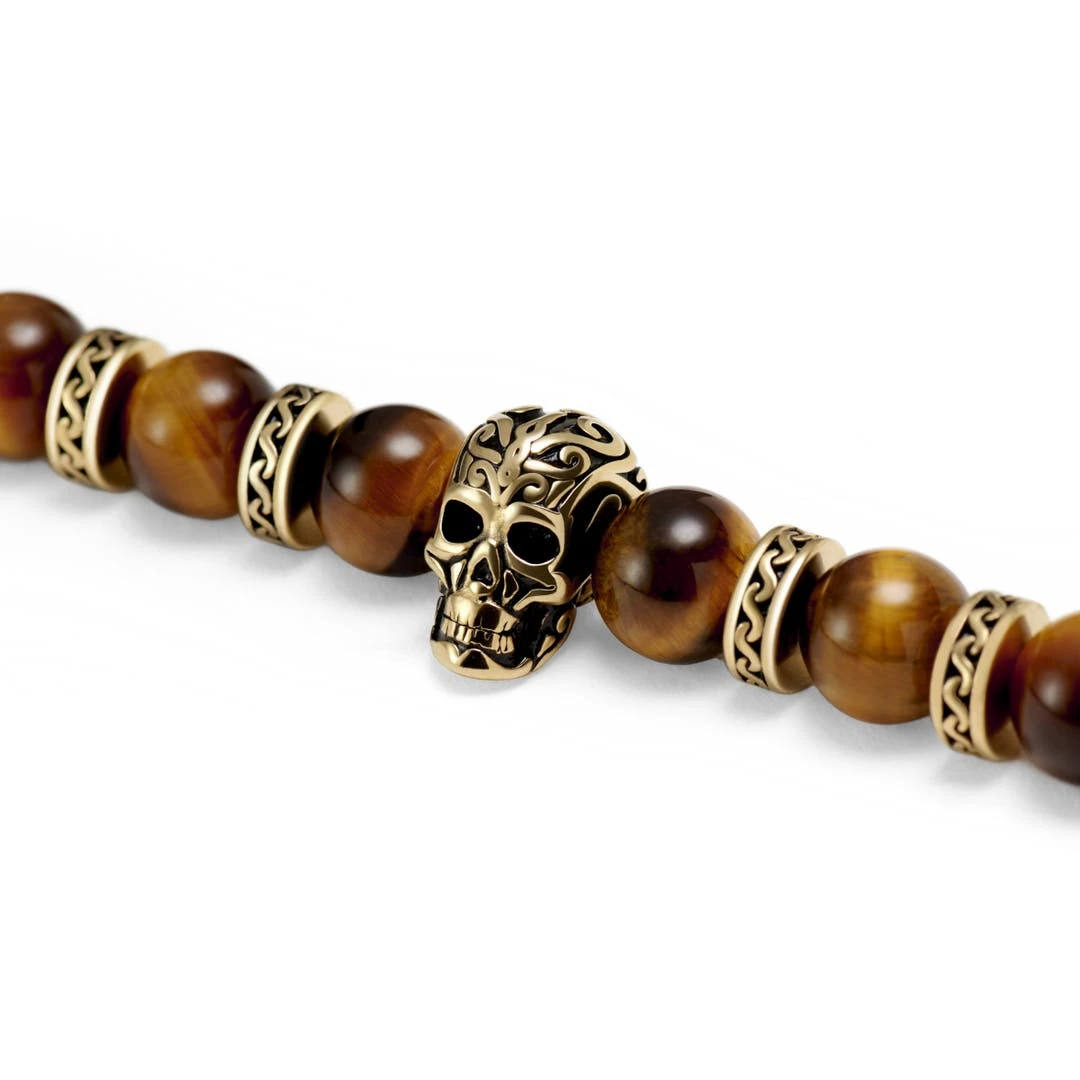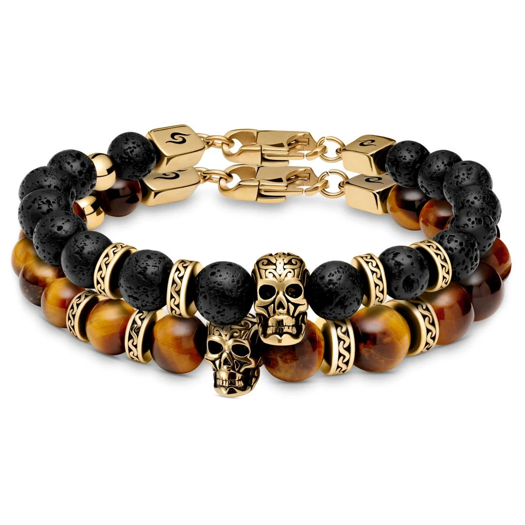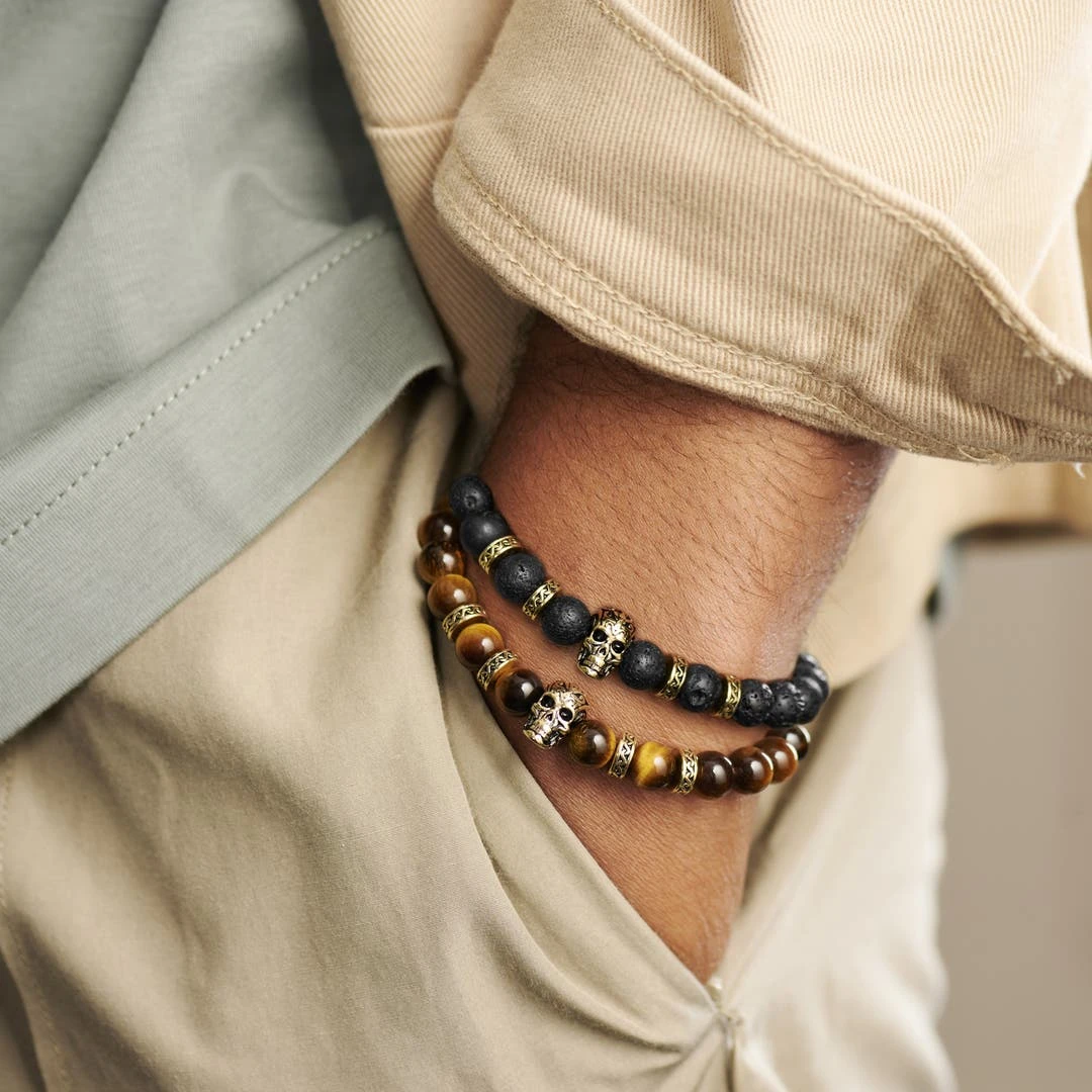 Arkai Bracelets Dorés Rico En Pierre De Lave, Oeil De Tigre Et Pendentif Crâne