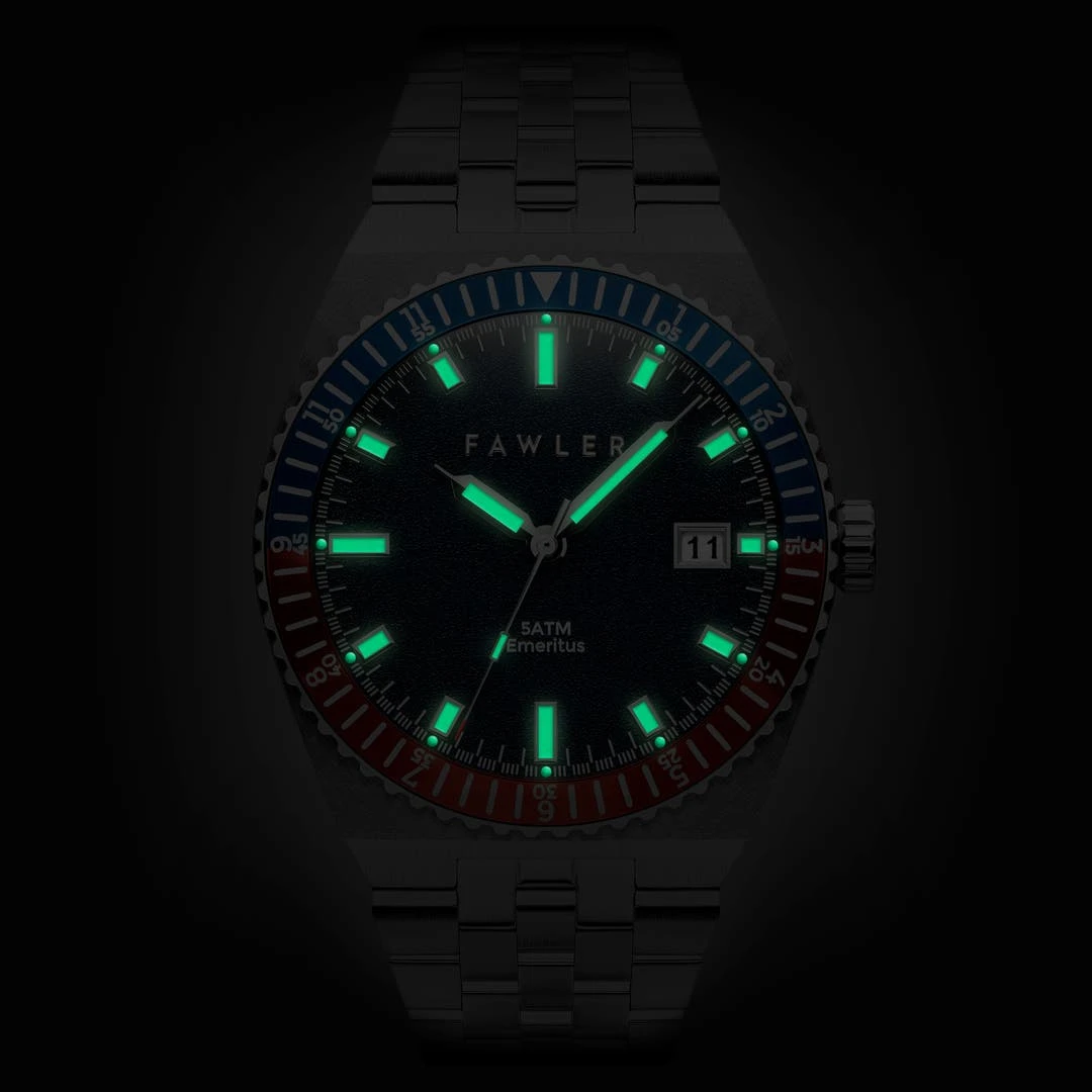 Son cadran bleu foncé est décoré d’aiguilles seringues et de graduations phosphorescentes pour que vous puissiez lire l’heure même dans la nuit la plus noire. Un revêtement antireflet sur son verre bombé vous offre une excellente lisibilité. Elle est équipée d’une discrète fenêtre avec affichage de la date située à 3 heures.
