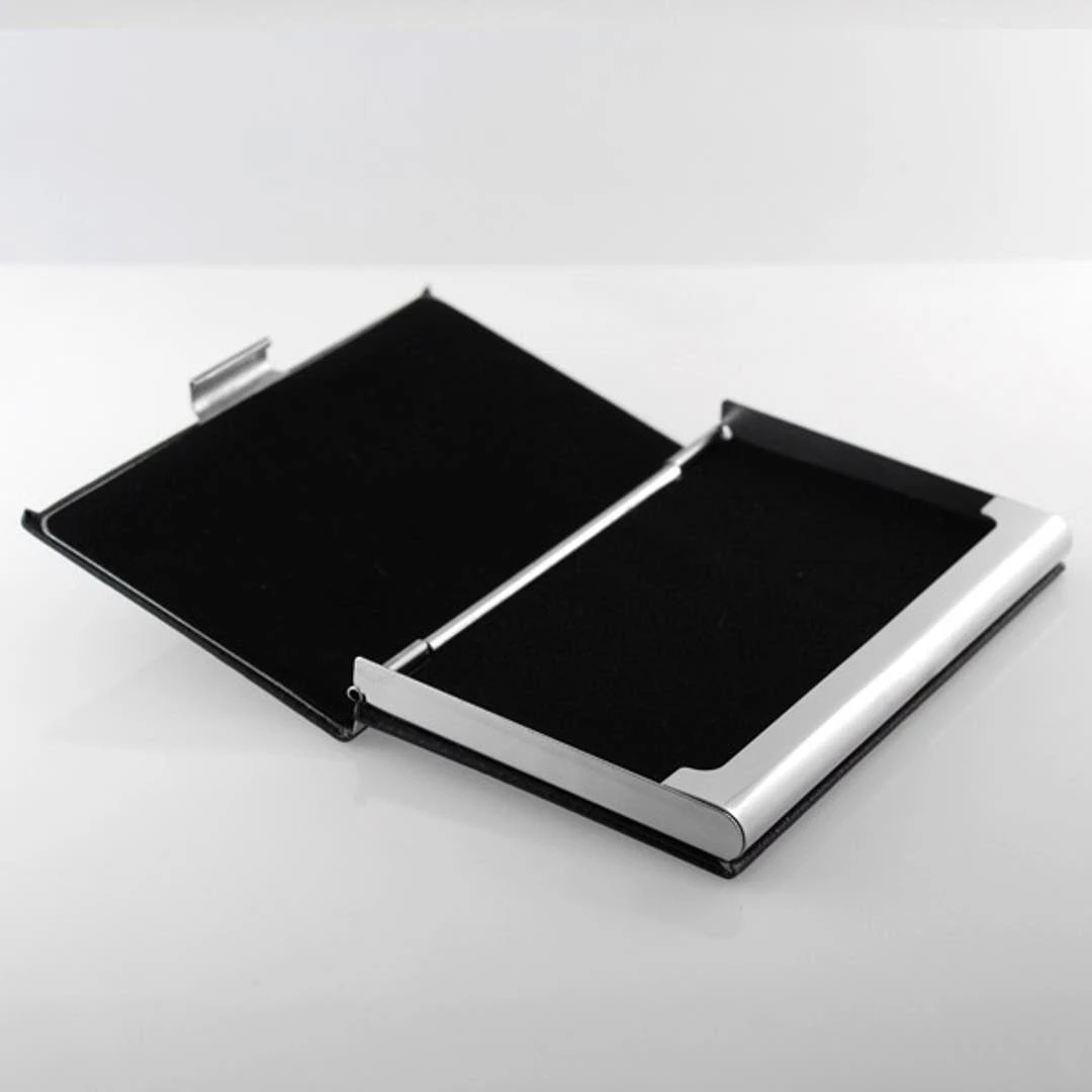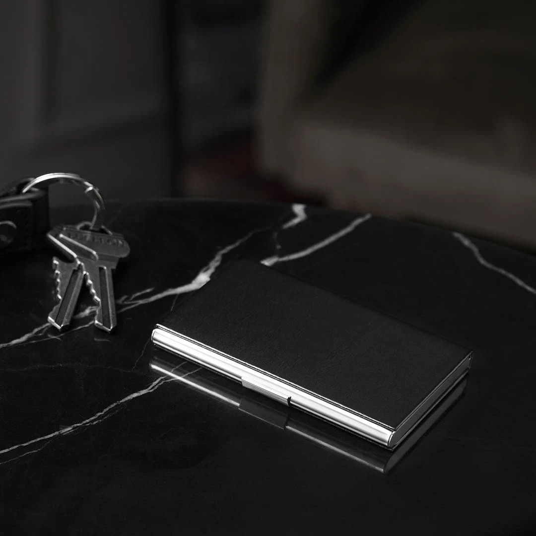 Les 2 faces (avant et arrière) de ce porte-cartes sont recouvertes d’une couche de cuir noir, le rendant doux au toucher.