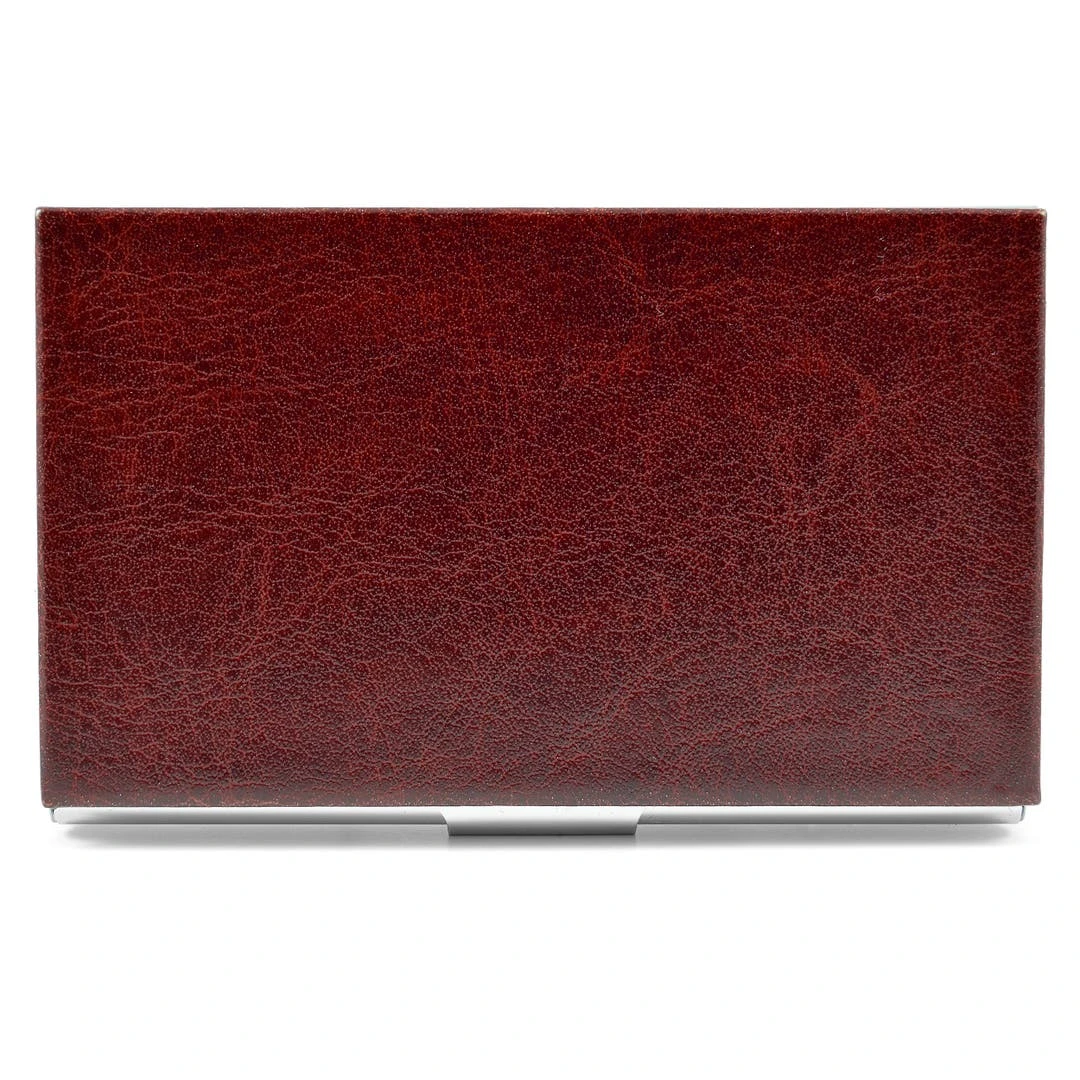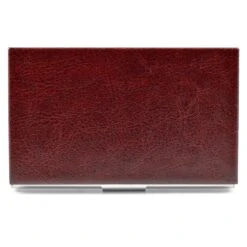 Ce porte-cartes est en acier inoxydable, cependant, l’extérieur est recouverte d’un joli morceau de cuir marron.