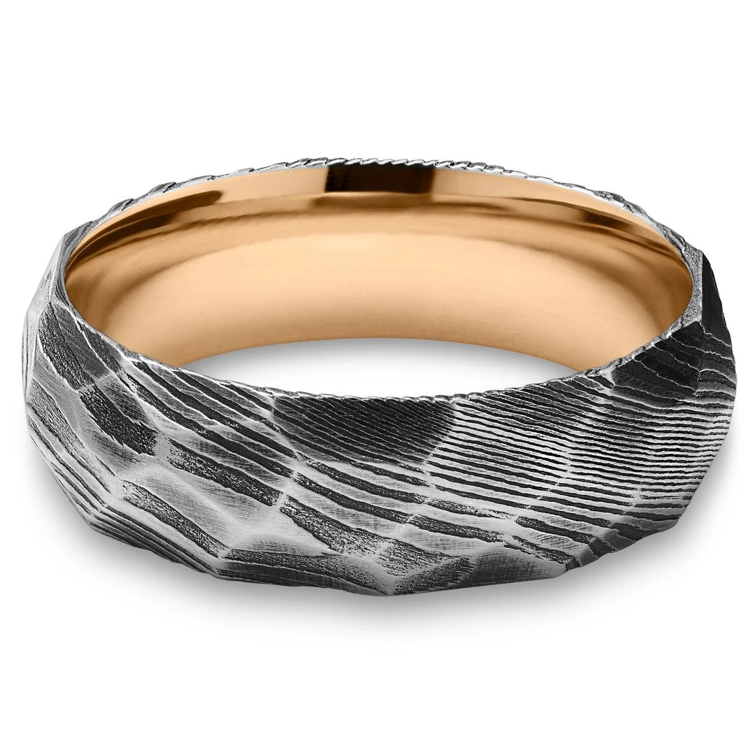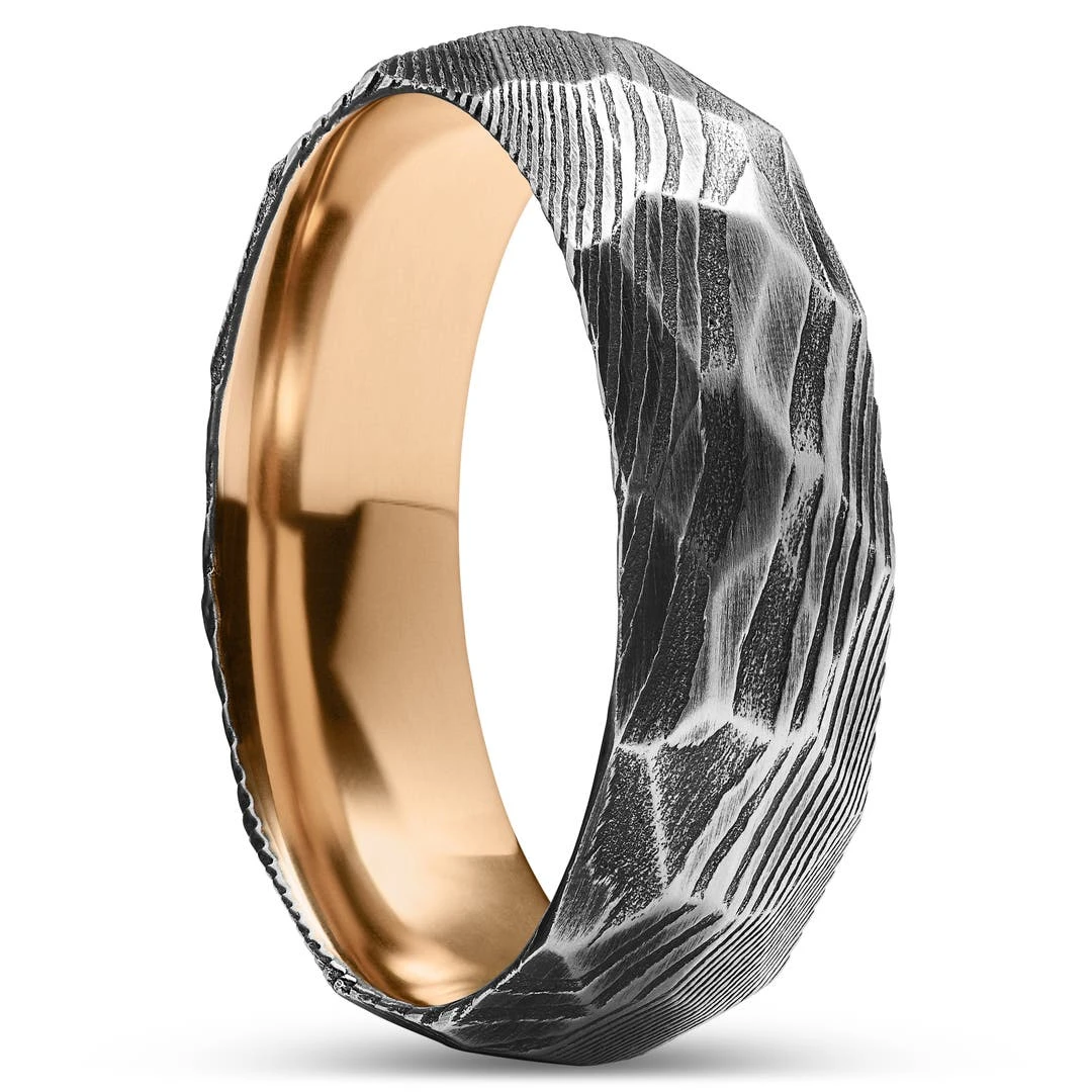 Lucleon Fortis | Anneau à Facettes En Acier Damas Gris Gunmetal Et Titane Couleur Or Rose – 7 Mm