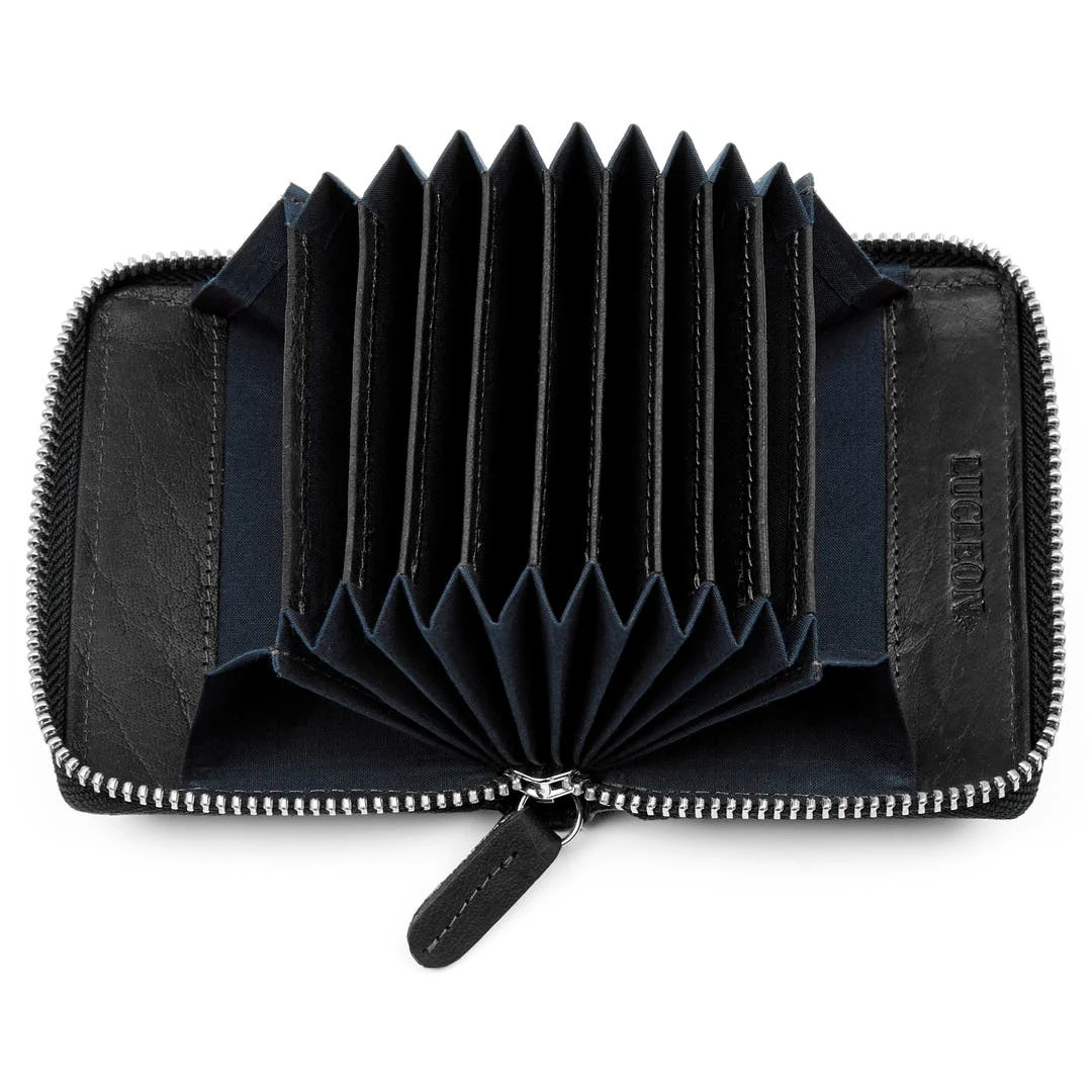 Cet élégant porte-cartes en cuir noir de la marque Lucleon est équipé de 9 poches en accordéon qui vous permettront de ranger toutes vos cartes au format carte de crédit. Sa protection RFID intégrée vous protégera contre les vols de données électroniques.