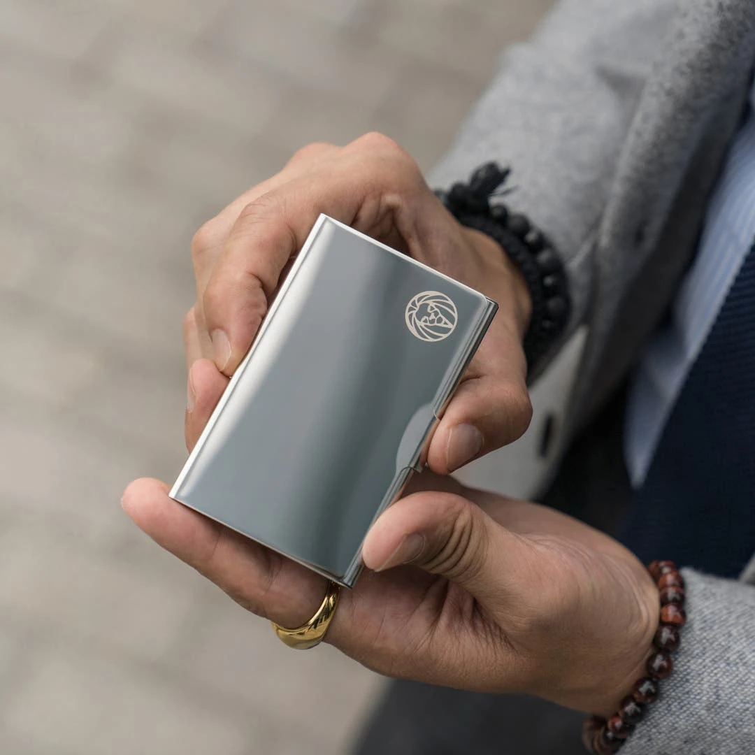 Un porte-cartes classique en acier inoxydable 304L au look épuré qui vous permettra de transporter jusqu’à 5 cartes. L’emblème de Lucleon est gravé sur sa face avant et une fine couche de velours noir tapisse sa surface intérieure.