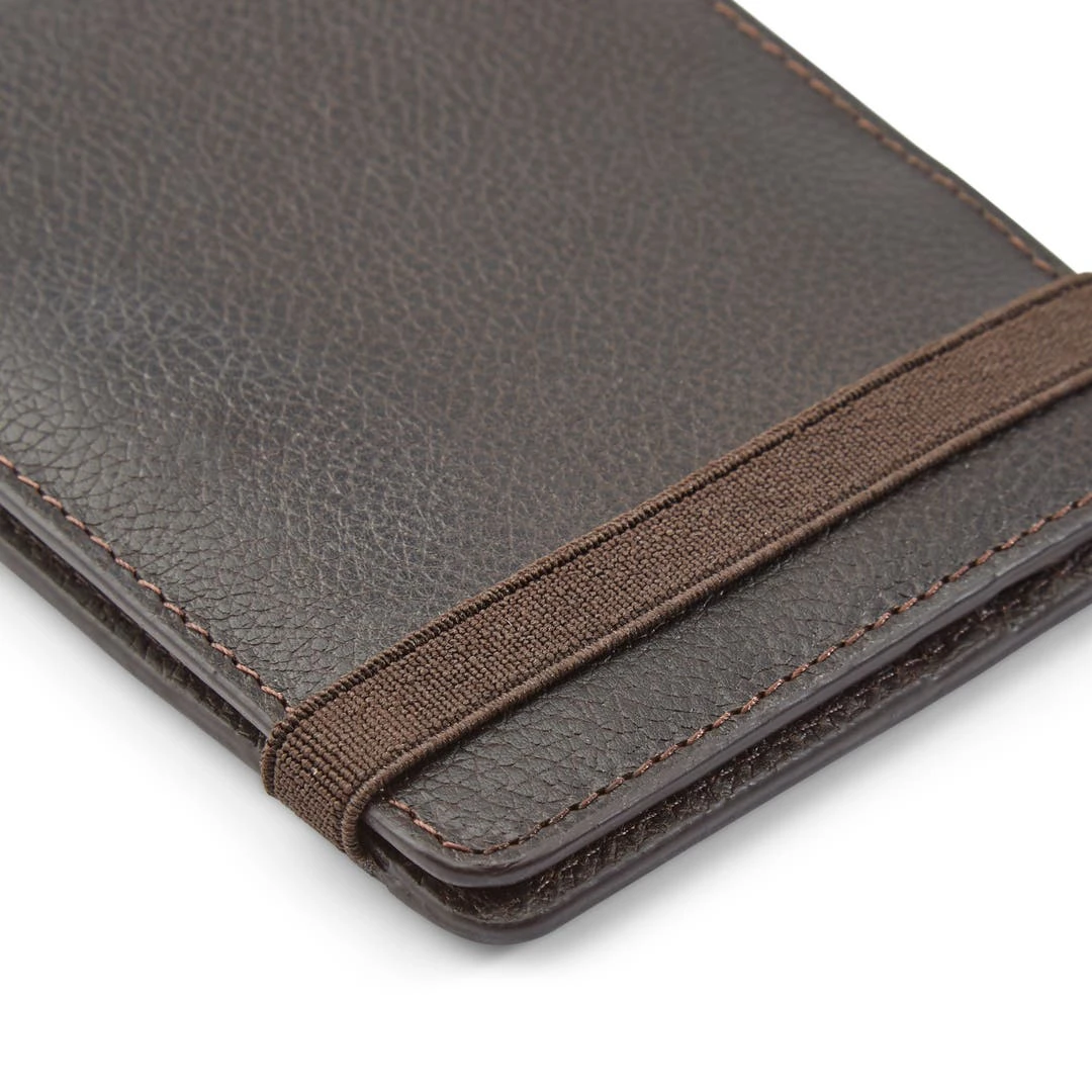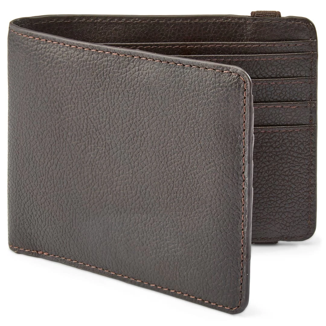 Ce portefeuille à deux volets en cuir marron foncé contient deux poches séparées pour de l’argent, deux pochettes supplémentaires et six emplacements pour cartes. Rangez votre carte d’identité dans la pochette séparée au dos.