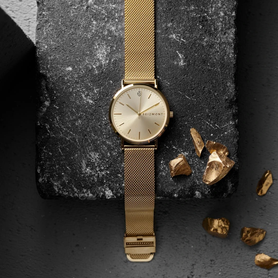 Cette montre dorĂ©e de Seizmont est dotĂ©e d’un bracelet en acier inoxydable de couleur assortie pour un rĂ©sultat aussi confortable qu’Ă©lĂ©gant. Son mouvement Ă quartz japonais est une garantie de prĂ©cision et de durabilitĂ©.