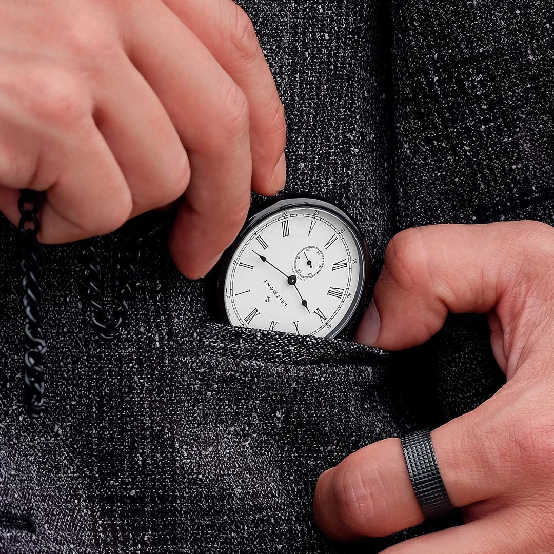 Son boîtier est fabriqué en acier chirurgical robuste qui résiste facilement à l’usure. Son cadran d’un blanc éclatant est décoré de chiffres romains noirs et possède un sous-cadran avec affichage des secondes. Une élégante chaîne noire dotée d’une pince solide à l’extrémité opposée vous permettra de la fixer à votre ceinture ou à votre poche.