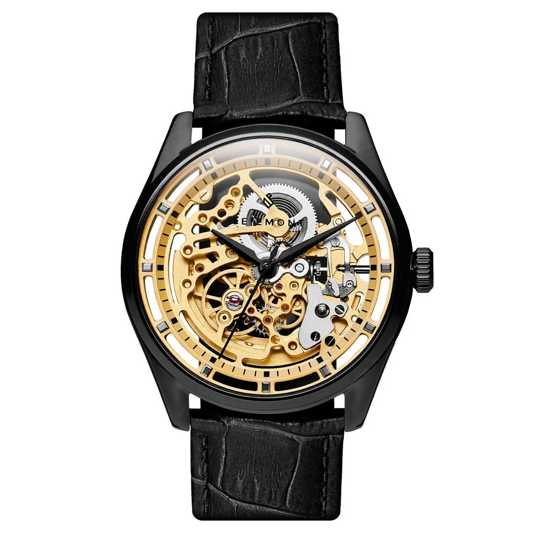 Cette magnifique montre automatique présente un cadran squelette et un boîtier d’exposition à l’arrière révélant le mouvement d’horlogerie à l’intérieur.