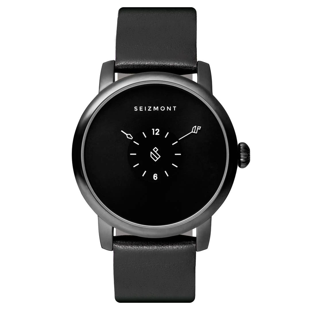 Cette montre arbore un cadran noir, une surface noire et un bracelet en cuir noir. Les chiffres sont placés au centre du cadran pour que les aiguilles des minutes et des heures pointent vers eux. Lire l’heure ne pourrait être plus simple.