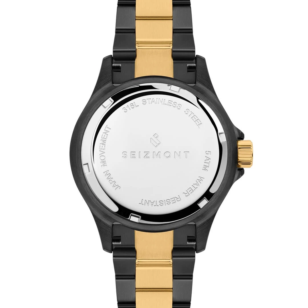 Son bracelet en acier inoxydable 316L couleur noir et or est équipé d’une robuste boucle déployante réglable qui maintiendra son boîtier de 42mm en toute sécurité autour de votre poignet.