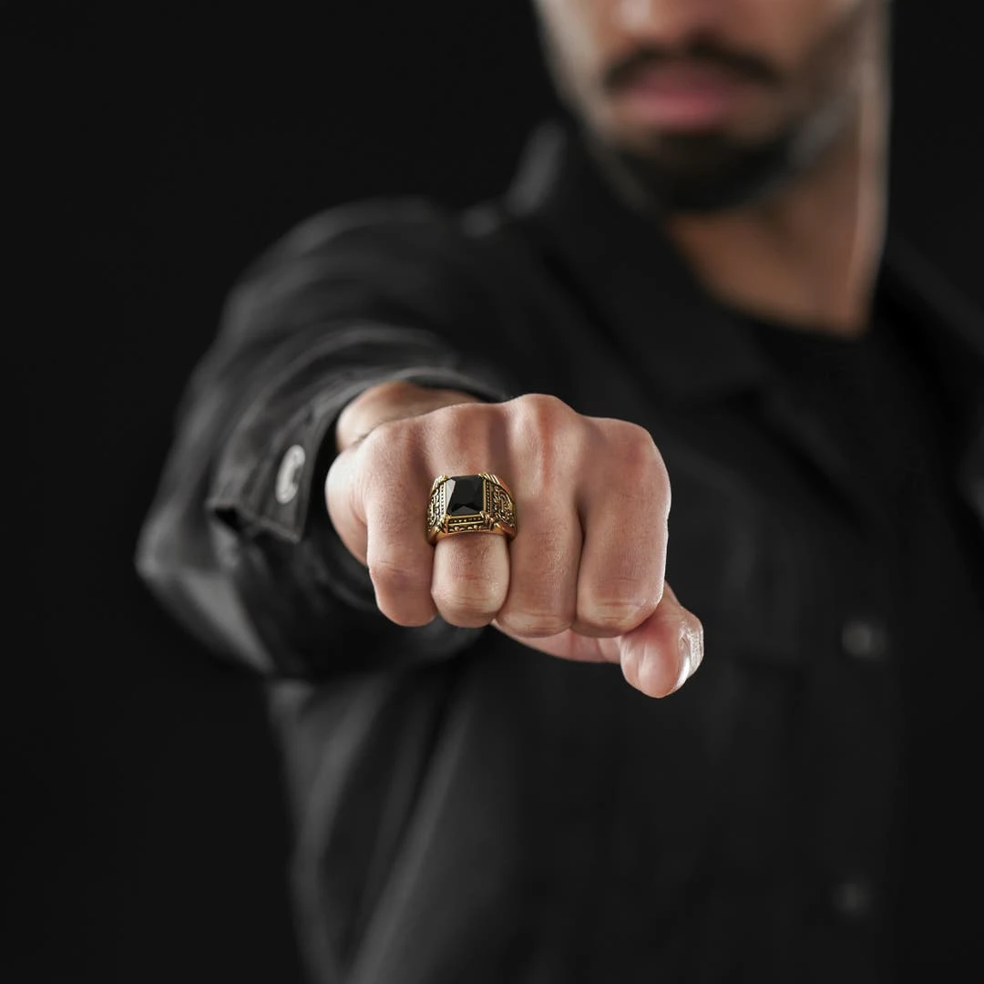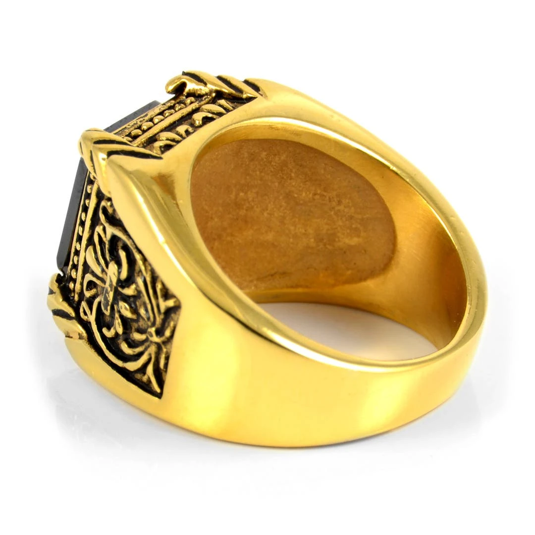 SteelCZ Chevalière En Acier Doré à Pierre Noire